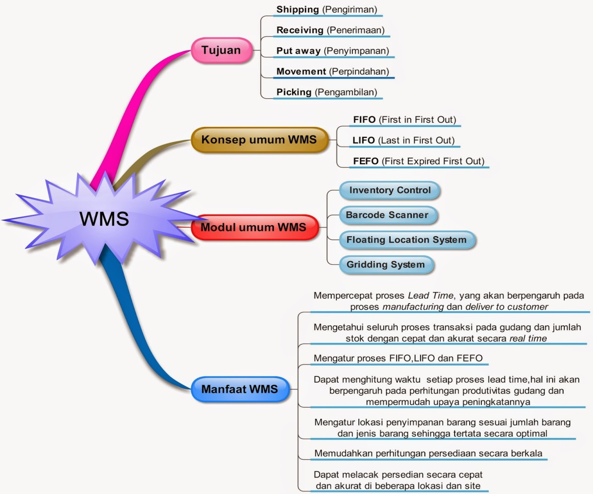 Merupakan bagian utama dan kunci dari modul ERP yaitu Supply Chain Managemen. Tujuan utama WMS dapat mengontrol seluruh proses yang terjadi dalam gudang mulai dari proses Shipping, Receiving, Putaway, Movement, dan Picking. Selain itu, WMS juga dapat memberikan fasilitas pemberitahuan lokasi penyimpanan barang berdasarkan jumlah barang dan jenis barang sehingga area penyimpanan di gudang gudang dapat terpakai secara optimal yang akan mempermudah mengetahui jumlah stok setiap barang.